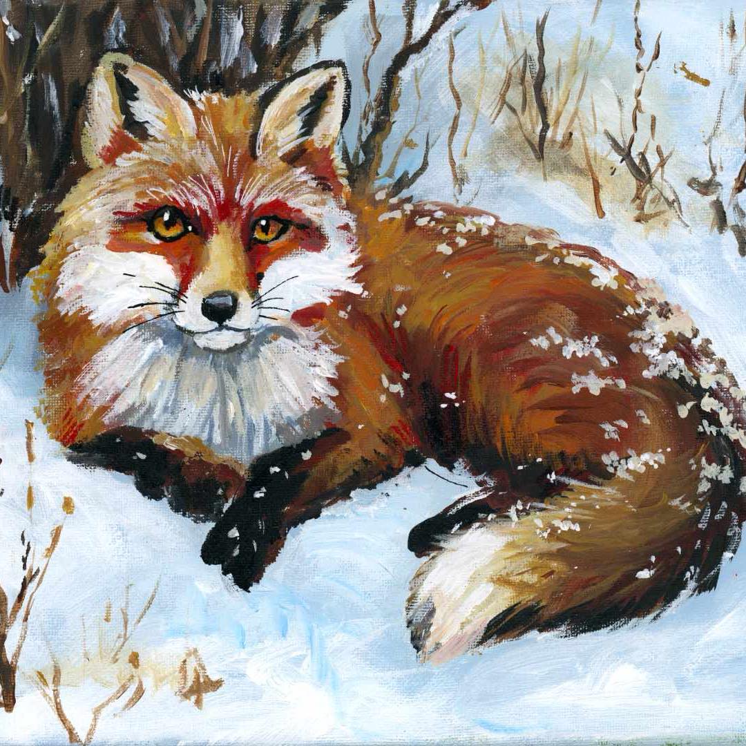 Experience the calming beauty of winter with this enchanting painting of a red fox nestled in the snowy landscape. Soft fur dusted with snow and tranquil surroundings make this scene irresistible. Discover how easy and rewarding painting this magical moment can be!