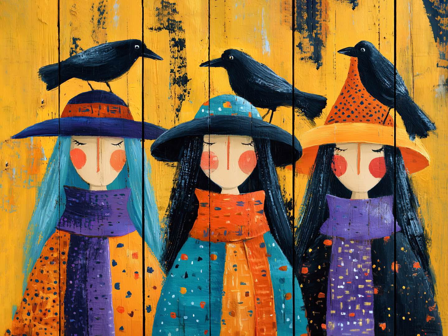 Three whimsical witches in bold hats and vibrant scarves share their space with playful crows atop their heads. Bright colors, joyful patterns, and expressive faces make this image a must-see feel enchanted and inspired to paint your own magical trio!